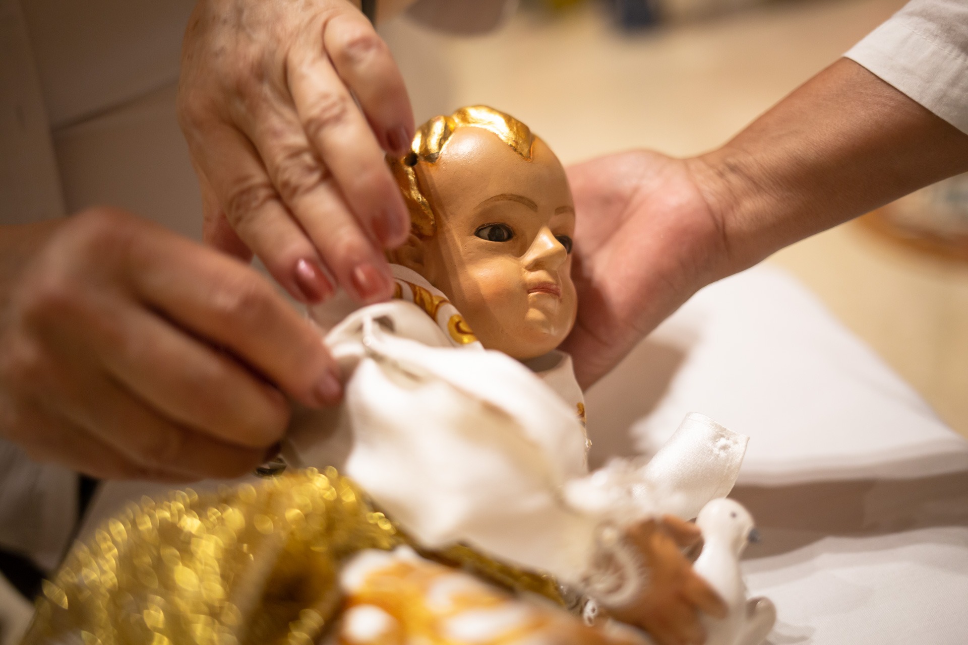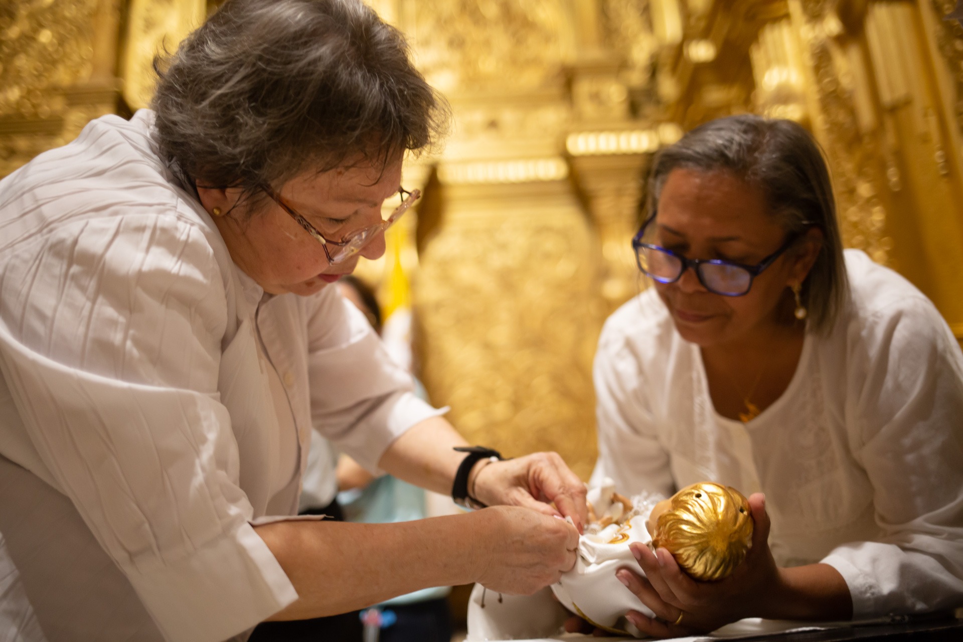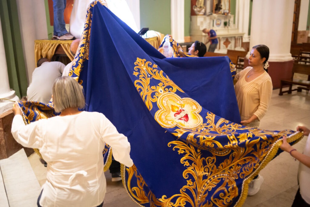 —Lo hacemos con devoción y mucho respeto —dice Silvia mientras el domingo por la noche cosía con aguja e hilo los bordes del manto que cubre la imagen y encaramada sobre una carroza que funciona como pedestal.