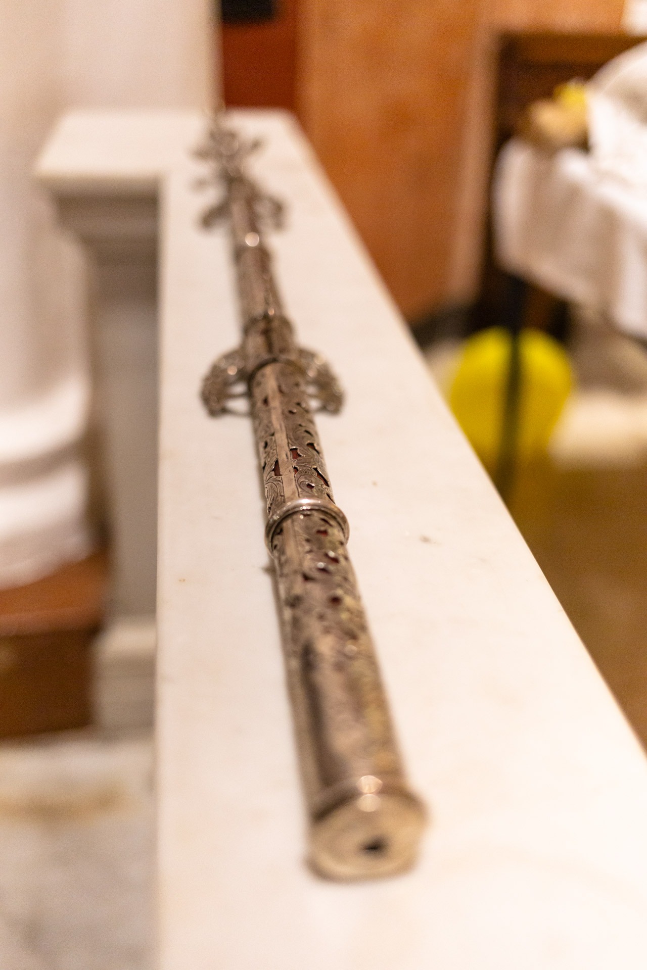 Monseñor Porras entró dos veces al templo, al inicio vestido de sotana negra y su solideo rojo, el pequeño casquete de seda que cubre su cabeza e indica su rango de Cardenal. Luego, al momento de la bendición de las velas rojiamarillas, en alusión a la bandera de España, ingresó con su mitra y estola, las vestiduras litúrgicas para presidir la misa.