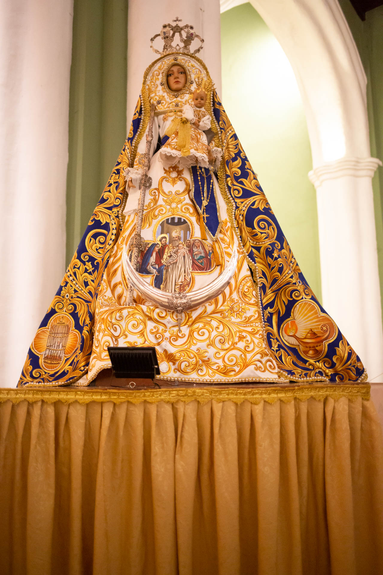 A puertas cerradas, al pie del altar de la Iglesia de La Candelaria de Caracas, la Virgen fue vestida con un traje de raso blanco en el que resalta una estampa de la presentación del Niño Jesús en el templo y luego cubierta de un enorme manto de gamuza azul intervenido con pirograbado, pintado a mano con acrílico y al óleo, y cuyos bordes llevan una hilera de perlas.