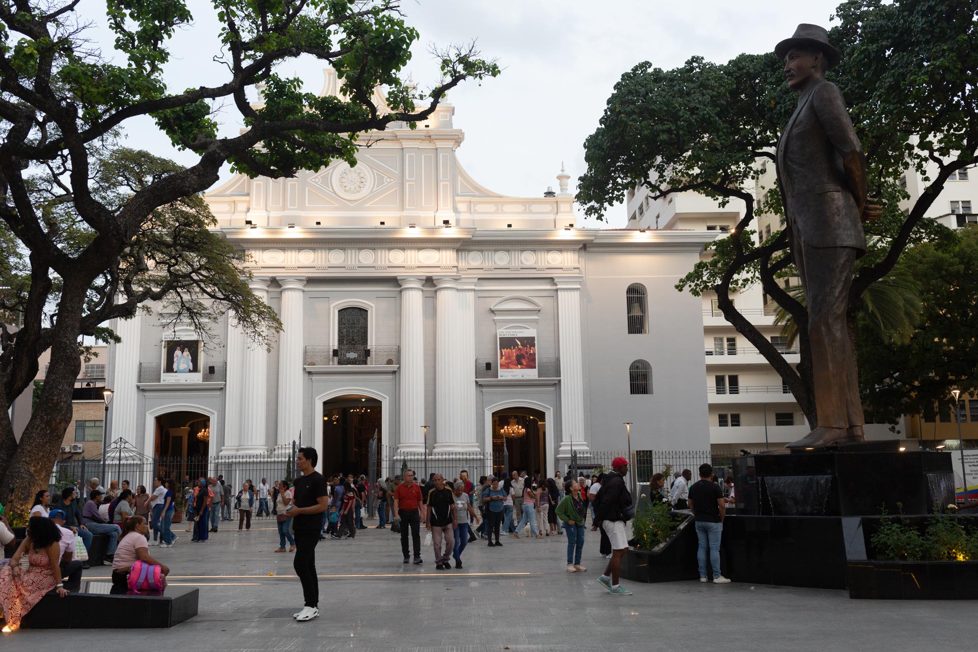 Justo antes de ingresar al recinto de la iglesia, la procesión con la santísima pasó detrás de la estatua de San José Gregorio Hernández ubicada en el centro de la plaza y se detuvo ahí unos instantes frente de la fachada del templo.