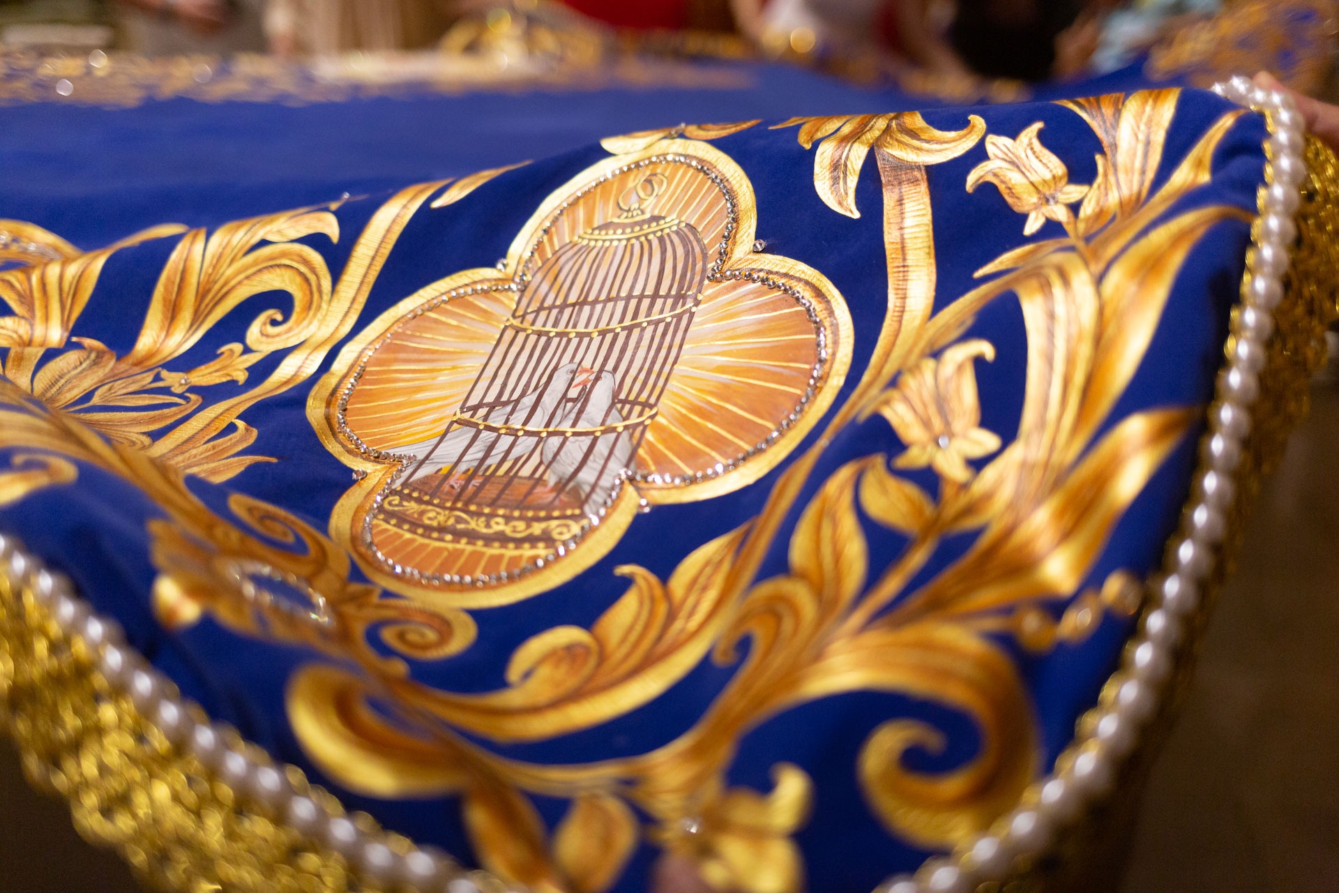 —El manto tiene elementos simbólicos: en un lado una jaula con dos tórtolos alude a la ofrenda que San José llevó al templo y en otro costado una lámpara hebrea con destellos de luz. Al centro una representación de la profecía de Simeón con el Sagrado Corazón de María atravesado con una espada —explica el diseñador Valencia.