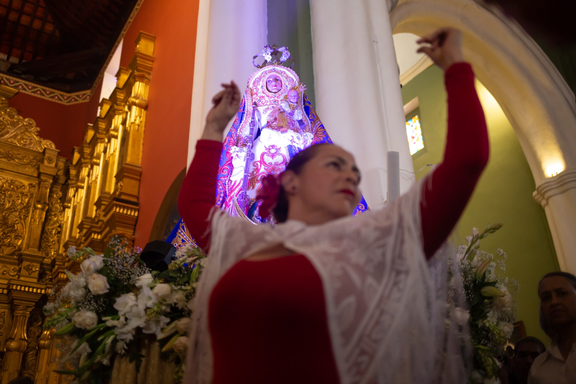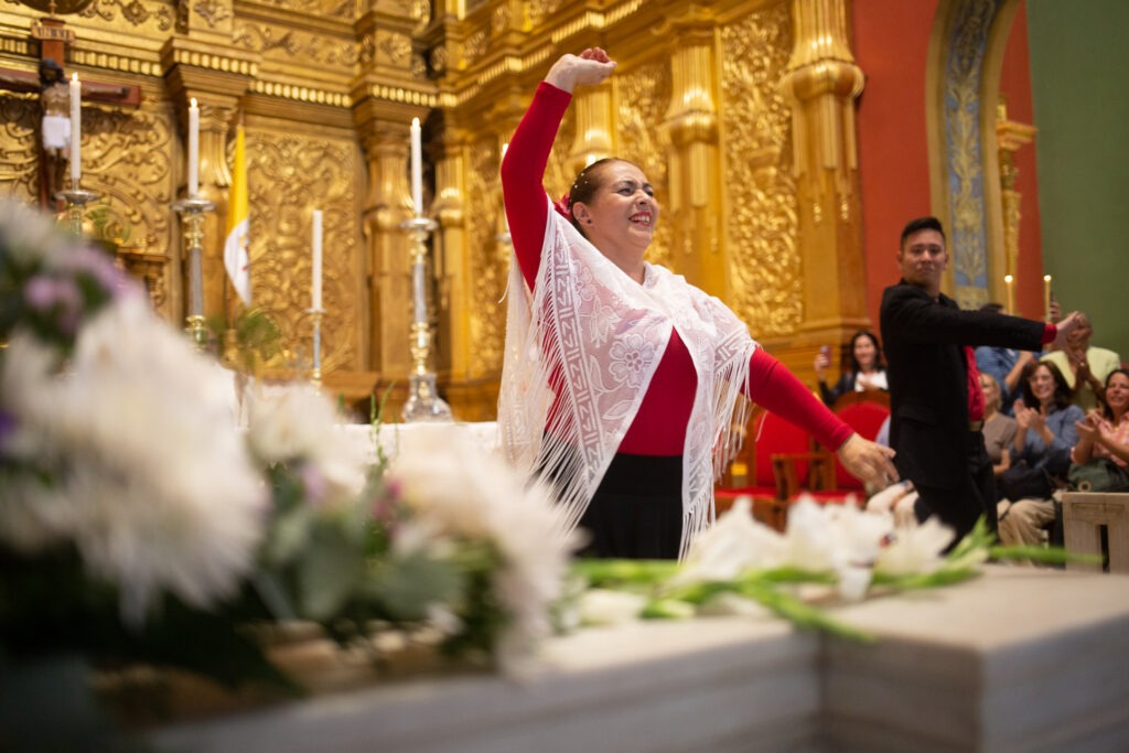Cantos y ritmos andaluces se integraron a la solemnidad religiosa con guitarras, palmas, panderetas y un cajón flamenco del grupo “Los gitanos de La Candelaria”, mientras dos bailaoras y un bailaor del “Calé del sur” le rindieron tributo a la santísima sobre un tablao que fue instalado frente del altar de la Virgen.